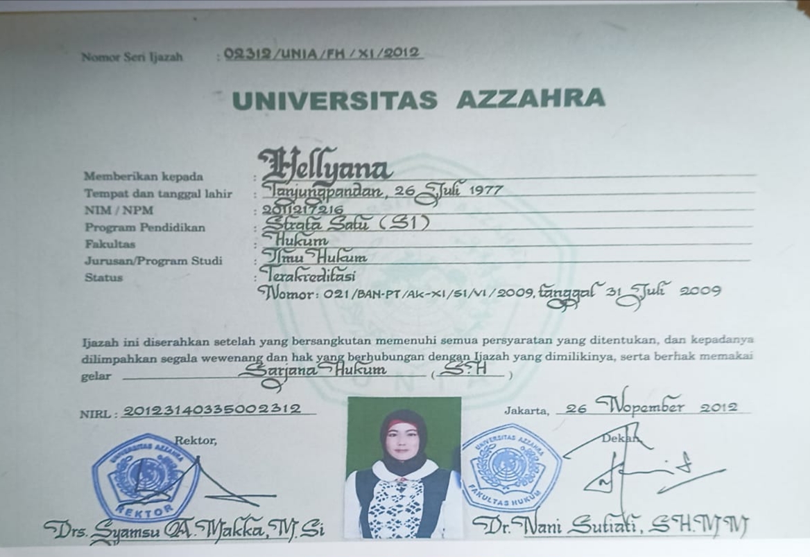 gelar SH terhadap Helliyana tak pernah diteken olehnya selaku Dekan Universitas Azzahra kala itu dan Rektor Drs. Samsu A Wakka S.si, dan berkas Helliyana tidak pernah ditemukan.