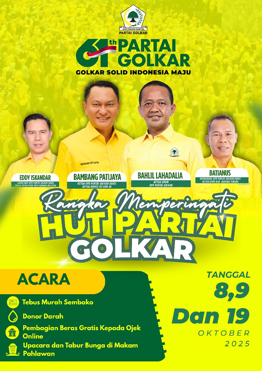CATATAN-MERAH.COM, PANGKALPINANG-Dalam rangka memperingati Hari Ulang Tahun (HUT) ke-61 Partai Golkar, Dewan Pimpinan Daerah (DPD) Partai Golkar Provinsi Kepulauan Bangka Belitung (Babel) menyiapkan serangkaian kegiatan sosial yang menyentuh langsung kebutuhan masyarakat.