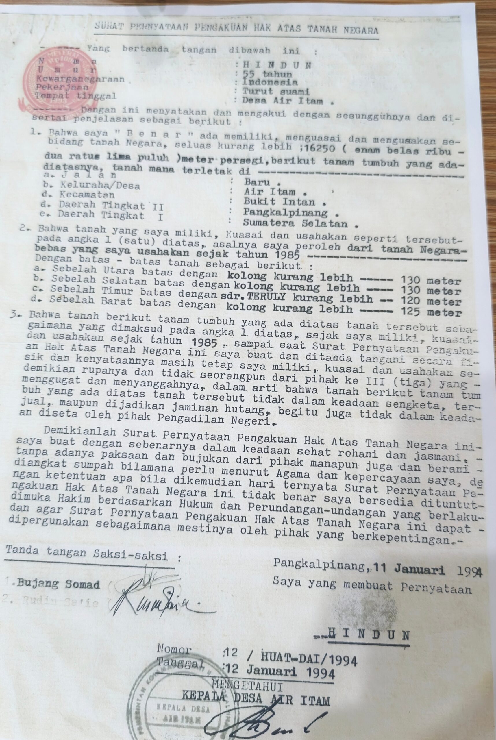 Dalam surat itu, Hindun (55 tahun), warga Desa Air Itam, tercatat sebagai pemilik sah lahan yang kemudian menyerahkan haknya kepada Achmadun Saha (48 tahun), seorang PNS warga Kelurahan Melintang.