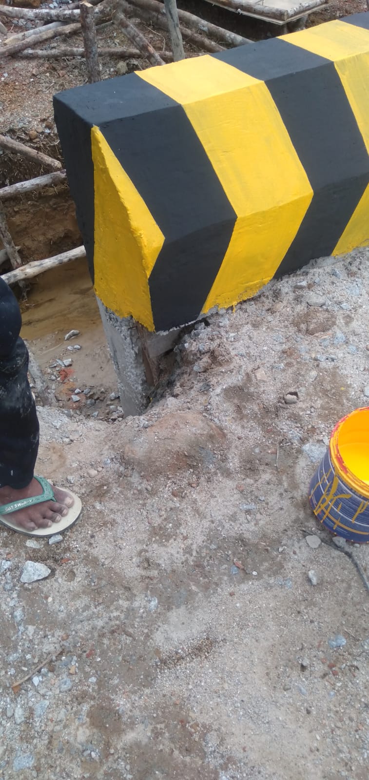 Pada titik lain, bangunan pelengkap jalan terlihat sudah dicat hitam-kuning, namun secara struktur masih menyisakan cacat fisik.